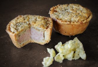 Puff Pastry (39%) (Fortified Wheat Flour (Wheat Flour, Calcium Carbonate, Iron, Niacin, Thiamine), Margarine (Rapeseed Oil, Palm Oil, Water, Salt), Water, Salt, Butter (Milk)), Pork (28%), Cumberland Seasoning (Rusk (Wheat), Fortified Wheat Flour (Wheat Flour, Calcium Carbonate, Iron, Niacin, Thiamine), Salt, Potato Starch, Herbs, Spices, Dextrose, Stabilisers: Sodium Diphosphate; Guar Gum; Carrageenan, Yeast Extract (Sulphites), Preservative: Sodium Sulphite (Sulphites), Antioxidant: Ascorbic Acid, Modified Starch, Spice Extracts), Caramelised Red Onion (11%) (Red Onion (60%), Muscovado Sugar, Malt Vinegar (Barley)), Water, Glaze (Water, Maltodextrin, Modified Maize Starch, Dextrose, Colours: Beta-Carotene; Caramel), Black Onion Seeds.